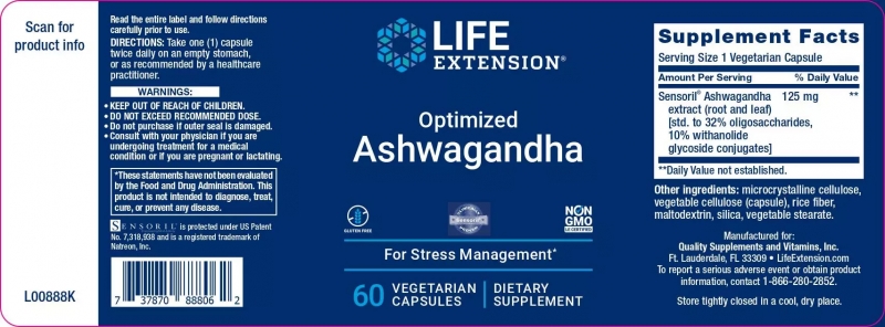 Extracto de Sensoril Ashwagandha (raíz y hoja) [std. hasta 32% de oligosacáridos, 10% conjugados de glicósido conanólido] 125 mg Otros ingredientes: harina de arroz, celulosa vegetal (cápsula), maltodextrina, estearato vegetal, sílice.