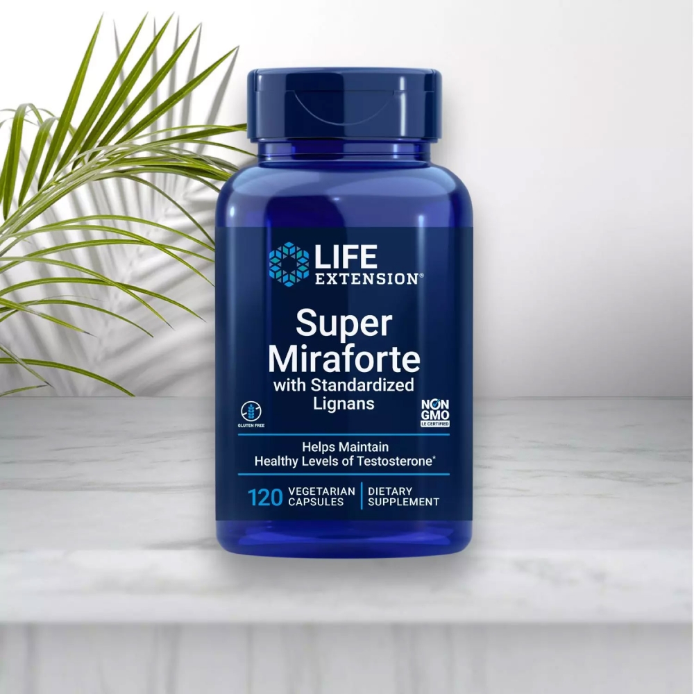 Super Miraforte con lignanos estandarizados refuerza los niveles saludables de testosterona libre y la salud masculina en general con potentes minerales y extractos que incluyen crisina, raíz de ortiga, Muira puama y más.